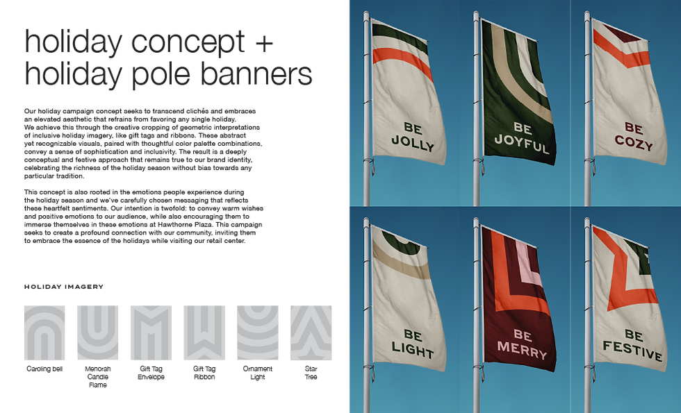 In addition, new branded pole flags were created to infuse brand messaging throughout the multi-acre parking lot of the plaza. These were also updated for the holiday season to align with a broader seasonal campaign that relied on geometry inspired by core brand elements.